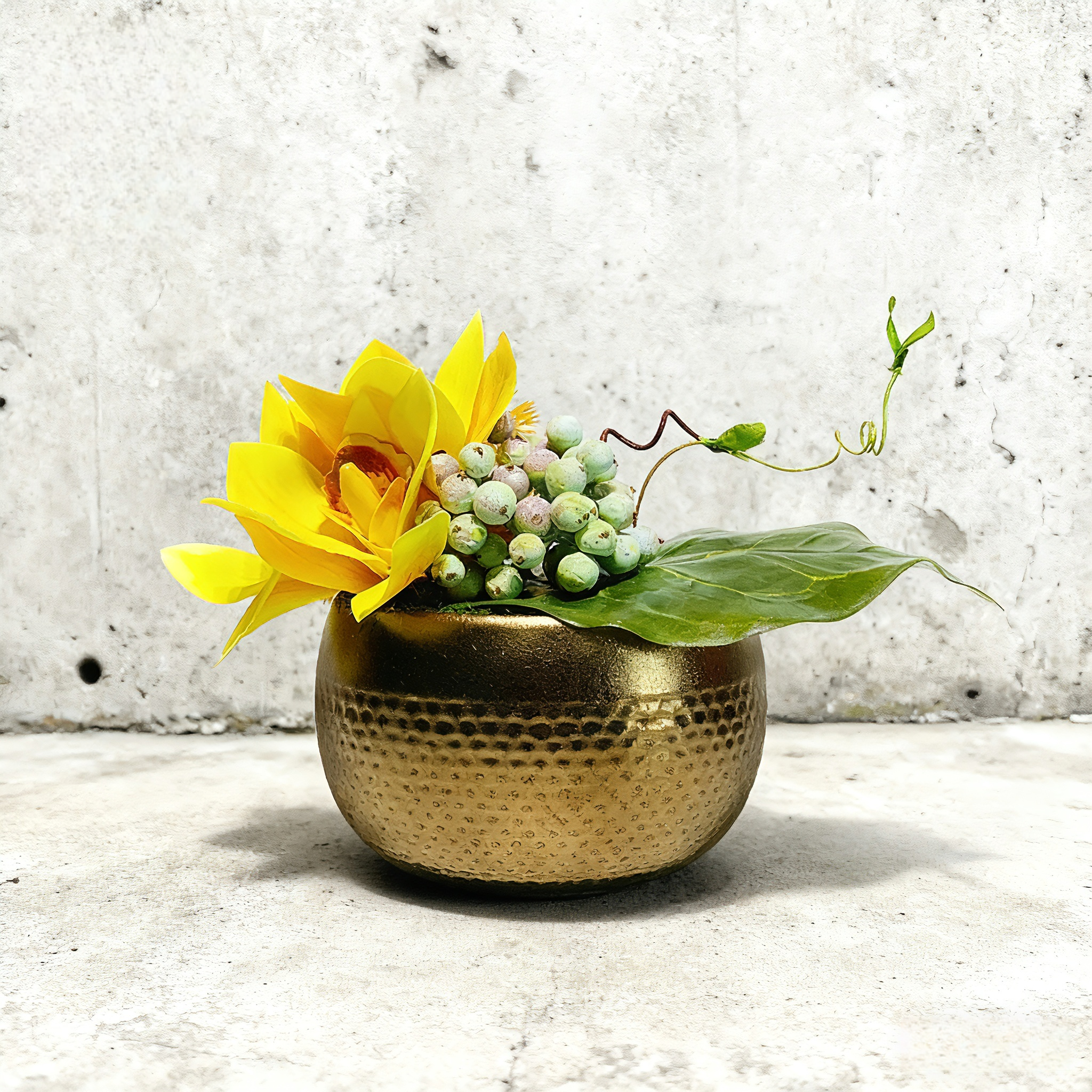 Handmade Silk Floral Arrangement: Yellow Orchid in Gold Ceramic Vase