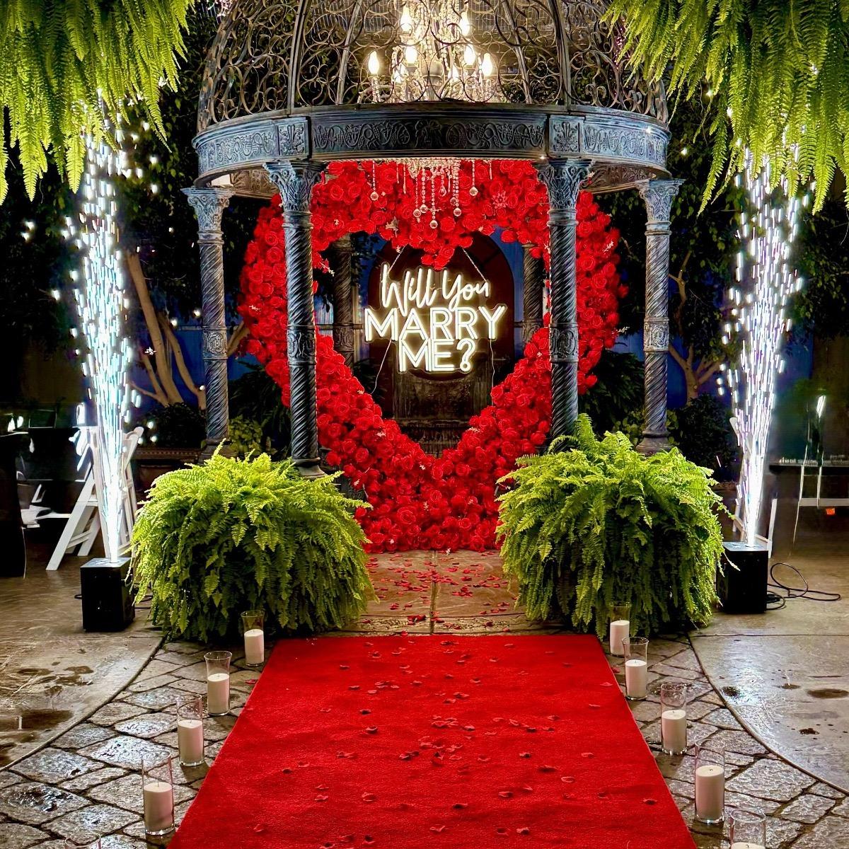 The client dreamed of a proposal that felt cinematic — bold, beautiful, and personal. Inspired by classic red roses and timeless love, we crafted a striking floral structure that captured the depth of their feelings.
